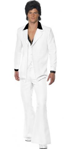 1970's Suit costume includes a white jacket and a black mock shirt and white waistcoat.