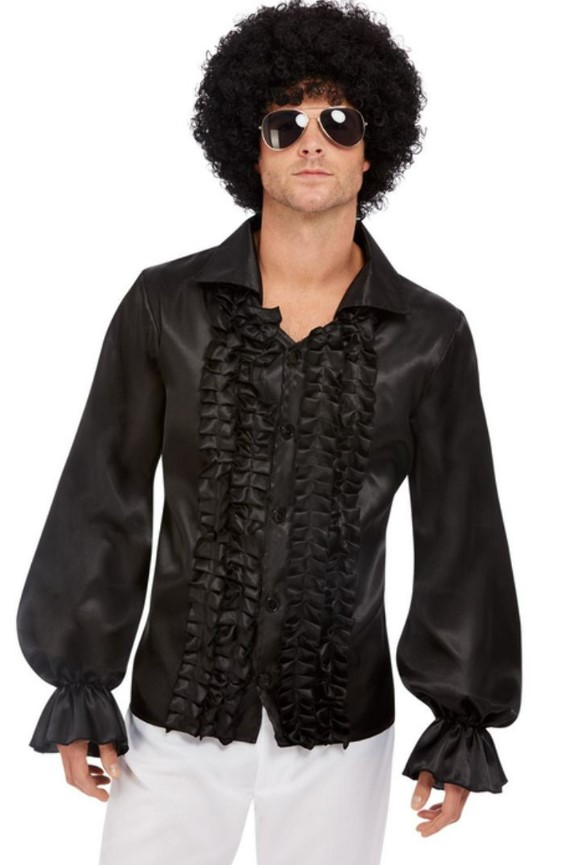 This shirt is the perfect accessory for any 60's or 70's themed party. This features a black satin shirt with ruffles along the front. Look groovy at any party or event!