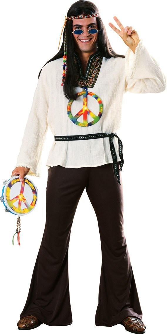 70's groovy man costume includes shirt, waist sash and bell-bottom trousers.
