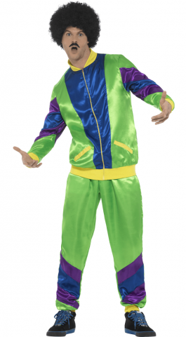 80's Height Of Fashion Shell Suit Costume includes a zip up tracksuit jacket and a pair of matching tracksuit bottoms. This 80's look feature trousers with an elasticated waist.