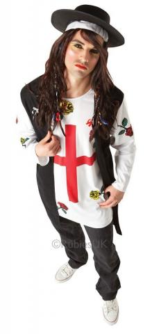 80's New Wave Popstar Costume includes a printed top with attached waistcoat. To complete the look a hat with attached braids is also included.