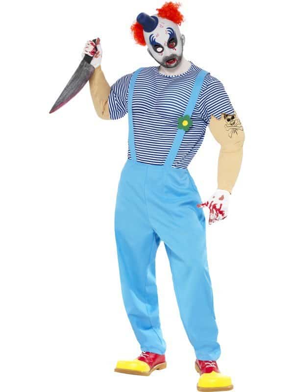 The scary Bubbles The Clown Costume comes complete with blue and white striped muscle top with an arm tattoo and a pair of light blue trousers with braces. To finish off the scary attire, the costume also consists of a scary clown mask with red hair and mini top hat.