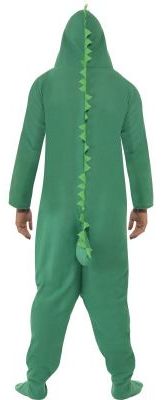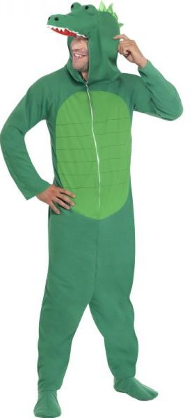 Adult Crocodile costume includes an All In One green zip up jumpsuit with a light green belly. The jumpsuit also features an attached hood with Crocodile facial features and a tail.