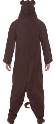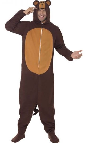 Adult Monkey costume includes an All In One brown jumpsuit with a zip up front and beige belly. The jumpsuit also includes an attached monkey hood with monkey facial features.