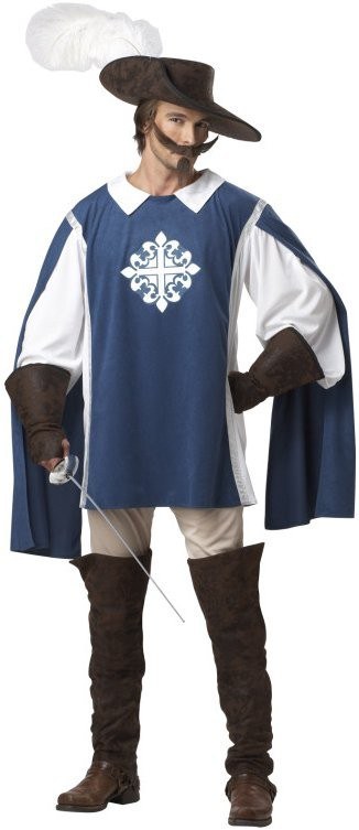 Adult Musketeer Costume features of a detailed blue and white tunic with attached arm drapes. To complete the look brown gauntlets, brown boot covers and musketeer hat with white feather are also included.