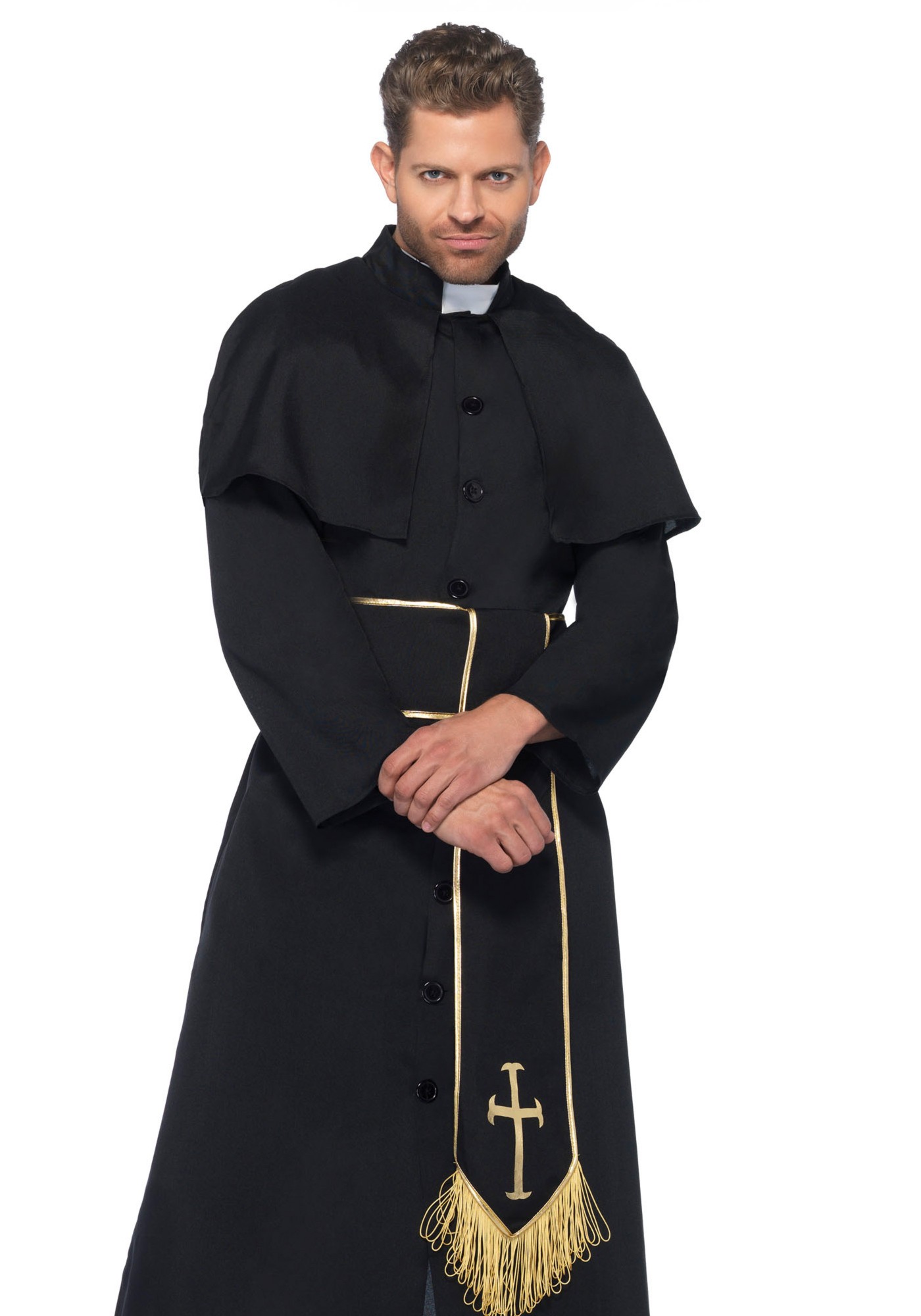 Men's Priest costume includes long black robe with front button closure and attached cape.