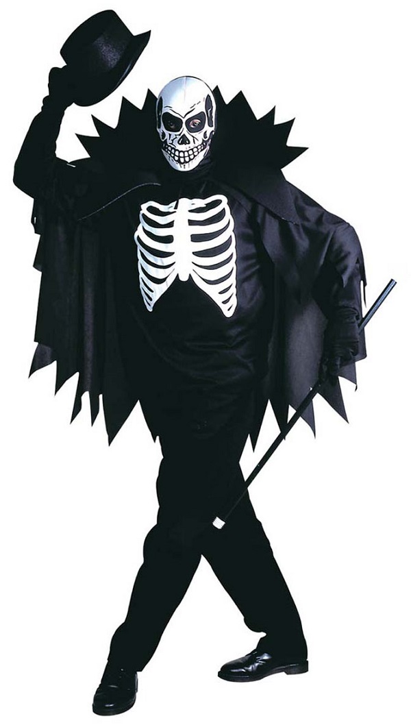 Creep out your guests at your next Halloween party with our Scary Skeleton Costume. Included in this costume is a black top with rib cage print and a black cape with a stand up collar. To complete the look an overhead skeleton mask is also included.