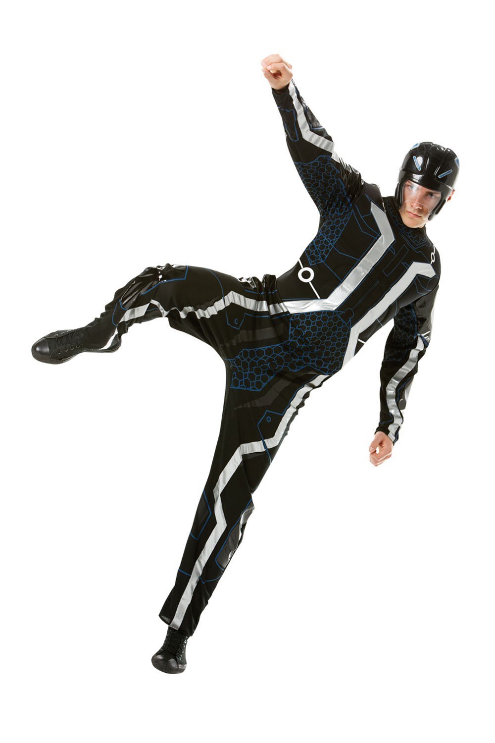 The costume includes a front and back printed, muscle chest jumpsuit and a cool Tron mask. The detailing on the costume is similar to that of the outfit in the film.