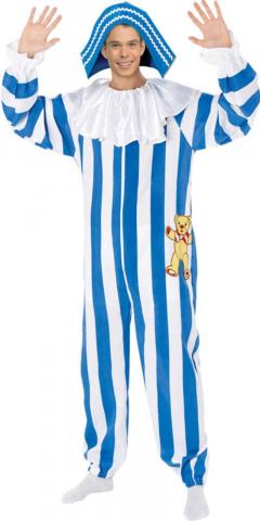 Andy Pandy Costume includes a blue and white striped jumpsuit with white frilled collar and ruffle at end of sleeve. Also included is an Andy Pandy hat.