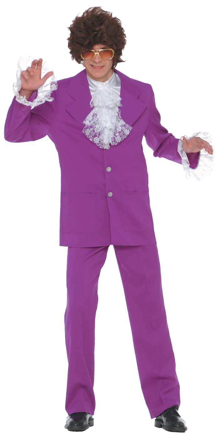 Mojo Man Costume includes a purple jacket with collar, lapels, white lace cuffs and real jacket pockets, purple trousers, white shirt front with attached jabot. The jacket has velcro closure. This Costume would make an ideal Austin Powers outfit.