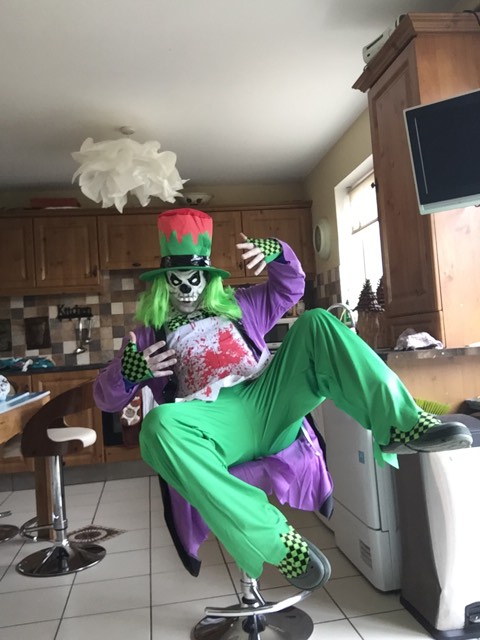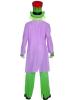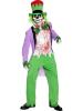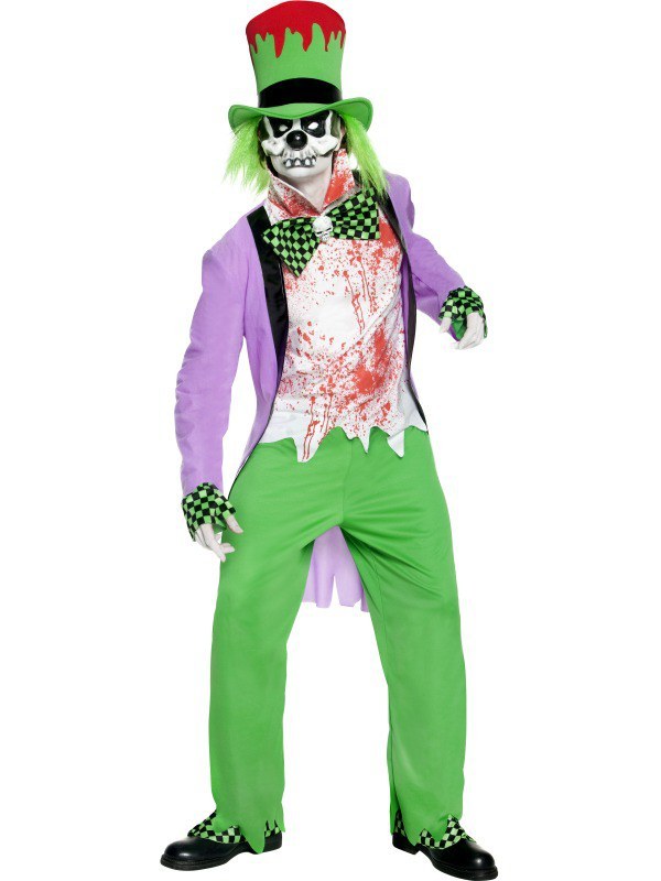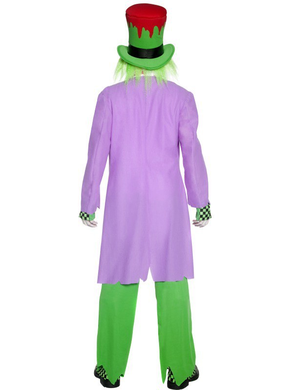 Our Bad Hatter costume consists of a long mauve jacket, a white blood stain patterned shirt with a green and black chequered bow tie with a central skull motif and a green and red top hat with attached green hair.
