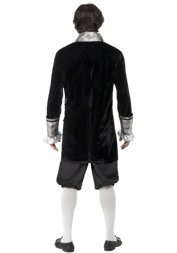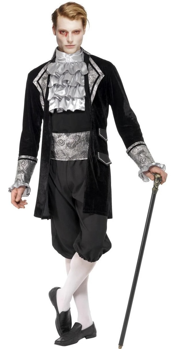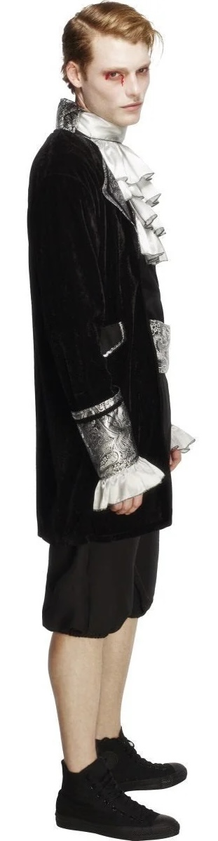Our Baroque Vampire Costume is both stylish a velvet black jacket with silver detail on the sleeves and collar, a black elasticated velvet trousers. Also included is a cravat with a ruffle detail to create the classic baroque style and a silver detailed cummerbund.