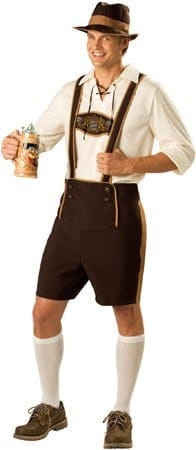 The Bavarian Guy costume includes Lederhosen, pullover cream shirt with lace up tie front. To complete the look there are knee socks and a hat with a tan rim and tan band to match the lederhosen.