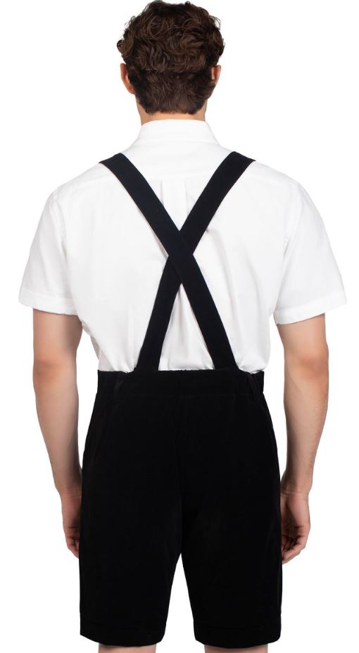 This outfit features embroidered stretch velveteen lederhosen with pockets and authentic bib suspenders.