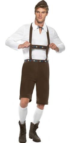 Traditional German Bavarian Man costume, perfect for an Oktoberfest themed part. This European costume consists of brown lederhosen knee length shorts and attached braces. There is a colourful design on the waist of the trousers and on the braces.