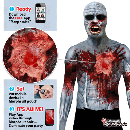 Beating Heart printed Zombie Morphsuit. Morphsuits are a full lycra bodysuits. The Morphsuits have a zip to open at the back and are designed so you can see where you are going and even drink through them.