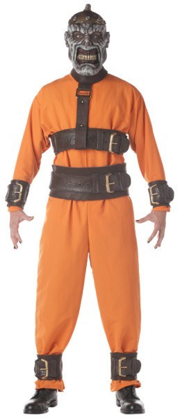 The costume includes an orange, full body prisoner suit and brown latex buckled belts, wrist and ankle cuffs. Belts and cuffs have a soft foam underneath for added comfort when wearing.