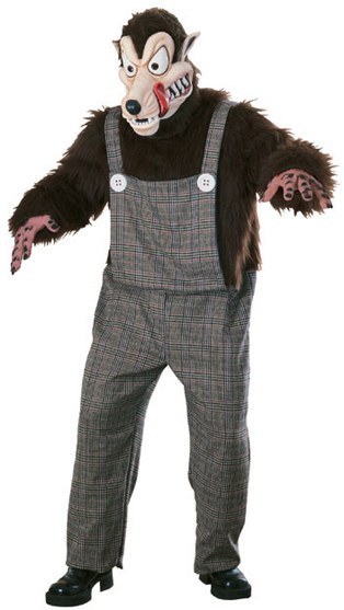 The costume consists of wolf head character mask, a faux fur jumpsuit with dungarees attached and gloves to complete.