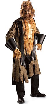 The costume includes a faux fur headpiece, a brown frayed edge jacket with an attached muscle chest. This vicious costume also includes a pair of faux leather cuffs and fur hand pieces.