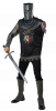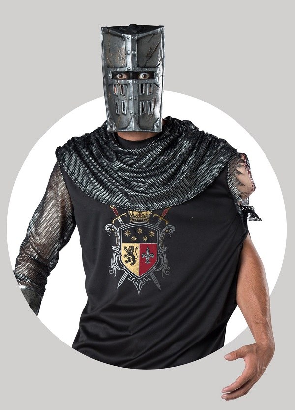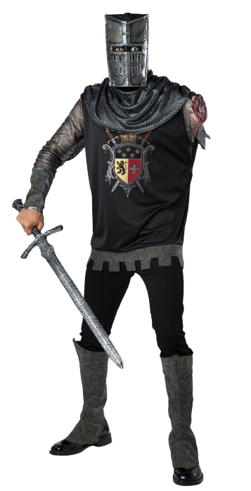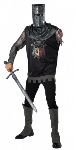 Black Knight Costume includes a tunic with metallic crest print and a detachable arm wound sculpt and a neck cowl. The tunic a concealed opening in tunic for arm when not hidden inside.