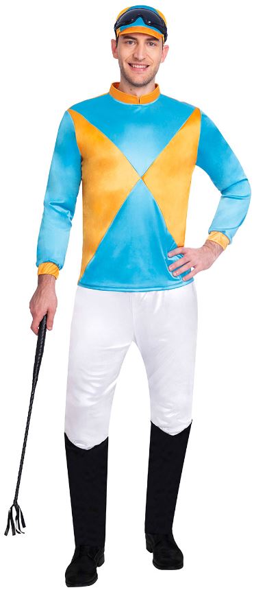 This Blue/Orange Jockey Costume includes Top, Trousers, Goggles, Hat.