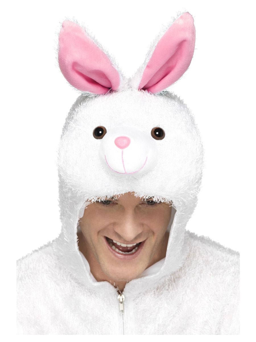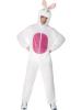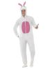 Adult Bunny costume includes a textured white jumpsuit with pink stomach and an attached hood with bunny face and ears.
