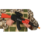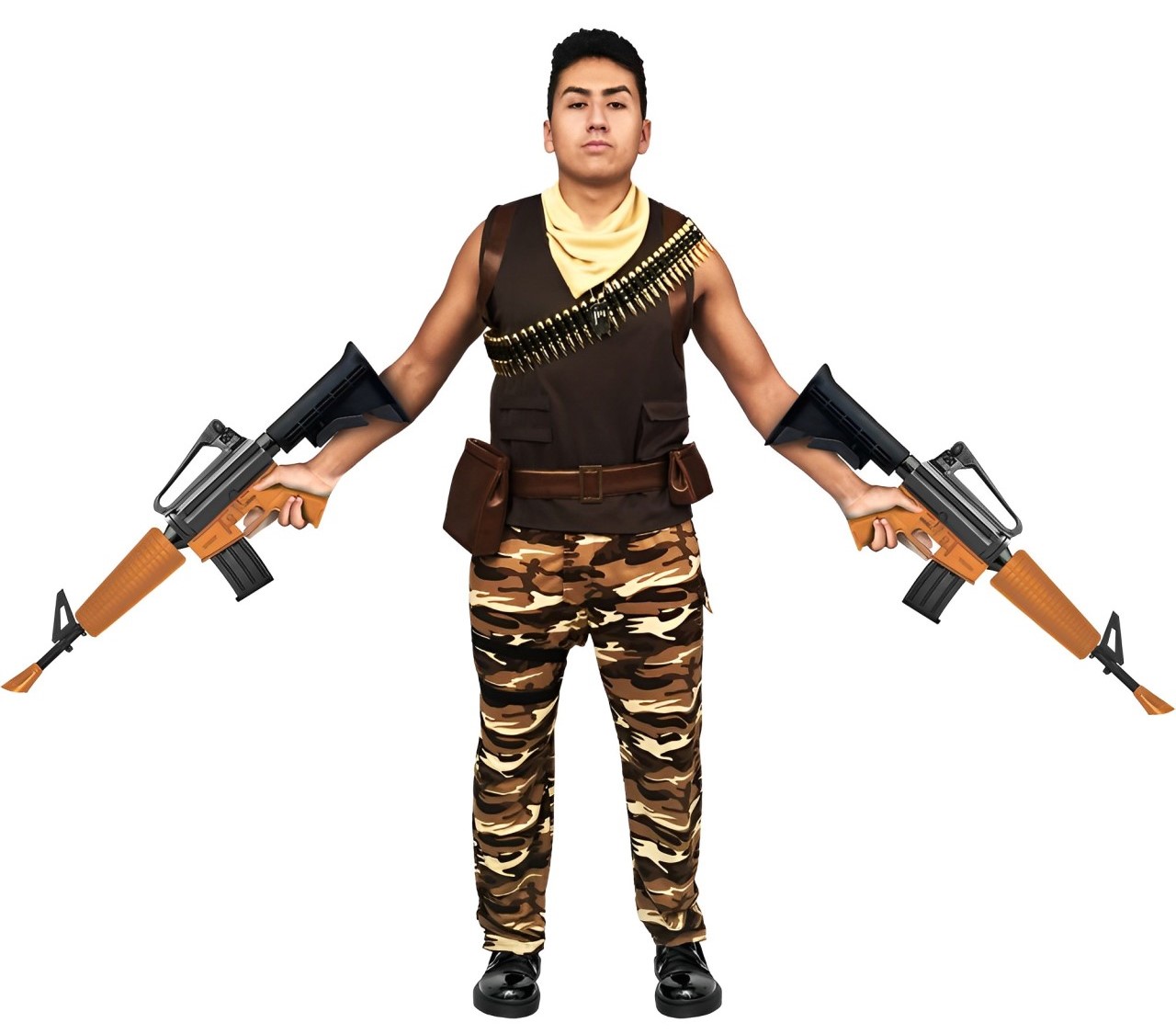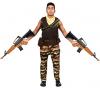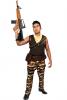 Included is a vest with a faux leather shoulder trim, camo pants and thigh straps.