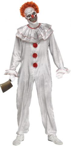 This Adult Carnevil Clown Costume includes silver striped jumpsuit with 3 red pom poms down middle of suit, and collar. To complete the look, a clown mask with attached wig is also included.