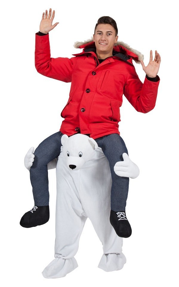 Travel in style on the back of a Polar Bear with this Carry Me Polar Bear Costume with fake legs.