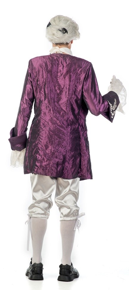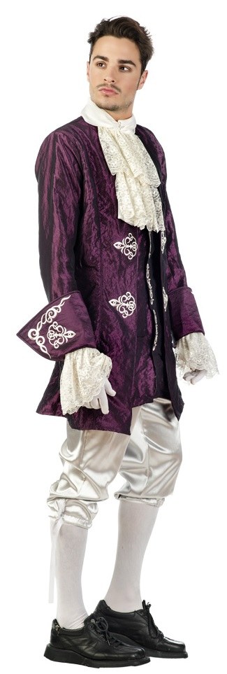 Casanova Baroque Costume includes a long purple coat with embroidered silver design and lace sleeve ends. The coat also features an sewn-in waistcoat and a lace jabot is also included
