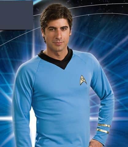 Classic Star Trek Top - Spock is a blue v-neck top with black neckline and Star Trek symbol and gold trim on the sleeves.