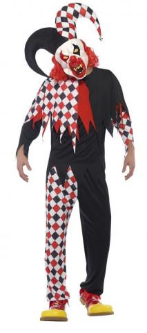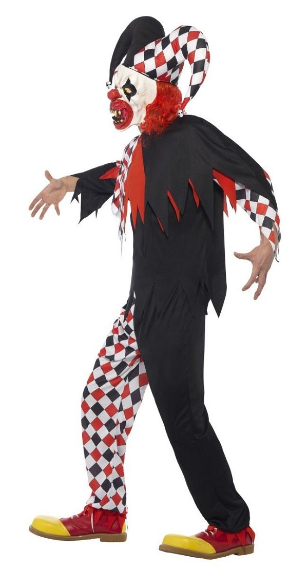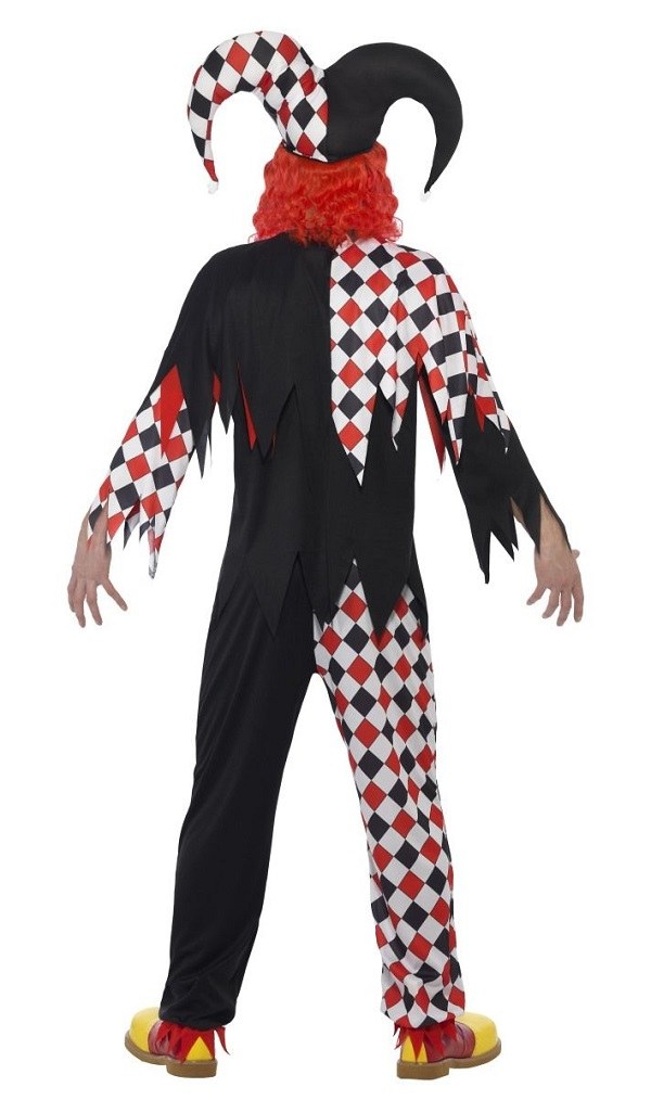 Crazed Jester Costume includes a black, red and white top with matching trousers. To complete the look a latex mask with attached hat and hair is also included.