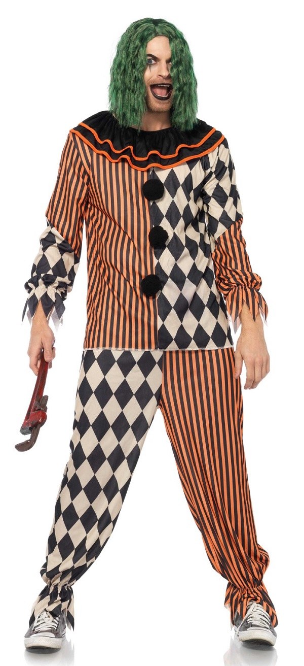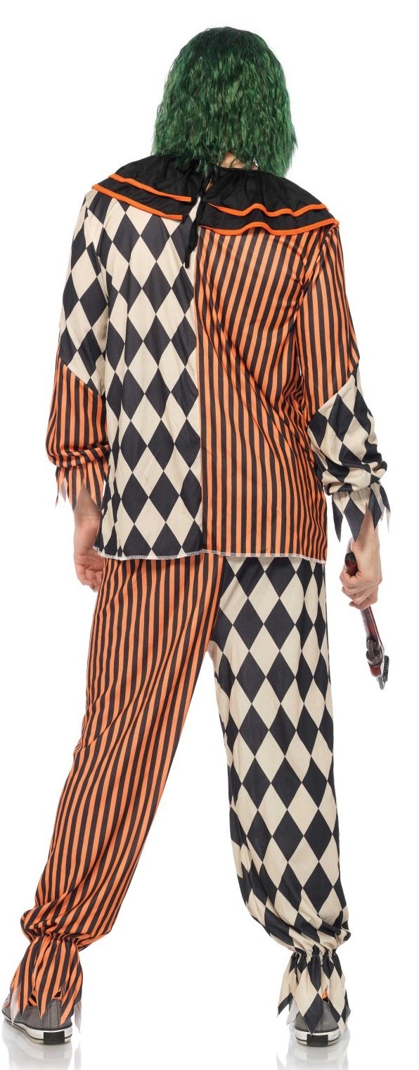 Creepy Circus Clown Costume includes a multi print ruffled collar clown shirt with pom pom detail and a pair of matching trousers.