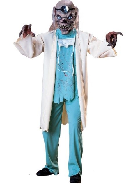 Cryptkeeper Doctor Costume includes a long doctors coat with an attached green top with blood stains and a pair of matching trousers.