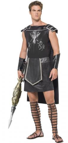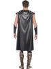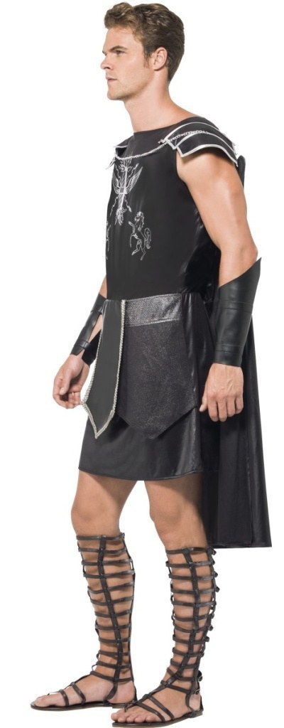 Mens Dark Gladiator costume includes a black printed tunic with black cape and belt. To complete the look a pair of arm cuffs aer also included.