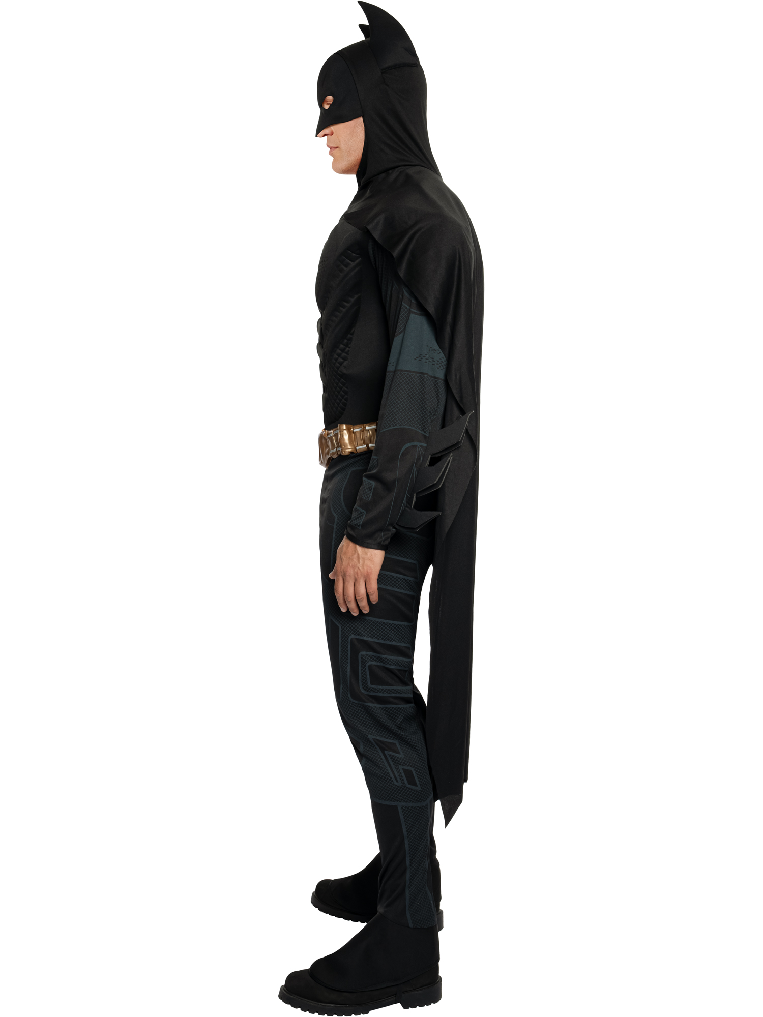 The Official Batman Dark Knight Costume includes a black top featuring chiselled muscles on the torso and screen printed sleeves made to look like armour, matching trousers with attached boot tops and full over the head character mask.