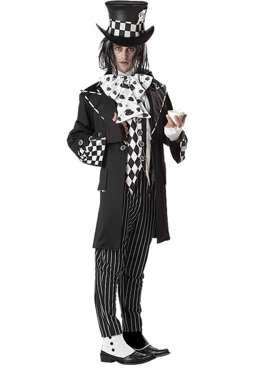 The Dark Mad Hatter costume includes a long black jacket with checkered and swirl details and a pair of pin striped trousers with an elasticated waist. Also included is a waistcoat featuring checkered, striped and swirl details, a top hat, two tone shoe covers and fingerless gloves. To complete this Wonderland style costume, an over sized tea cup print bow tie is also included.