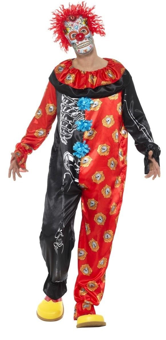 Deluxe Day Of The Dead Clown Costume includes a multi-coloured jumpsuit with collar and an EVA face mask with hair.