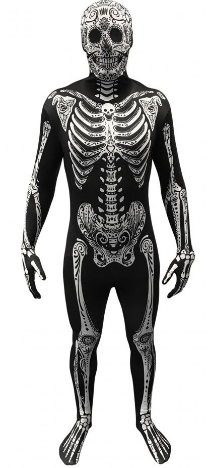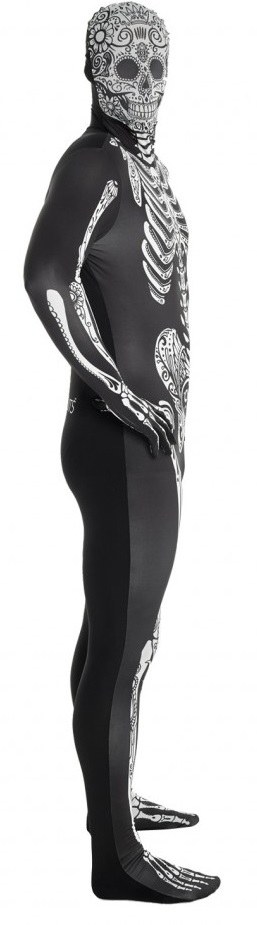 Day Of The Dead Morphsuit. This full spandex and lycra bodysuit with skull and bones print with a zip opening at the back.