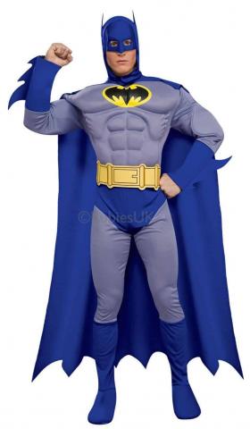 The Deluxe Batman costume for "The Brave and The Bold" series includes muscle chest shirt, pants with attached boot tops and elasticated waist, headpiece, cape and belt.
