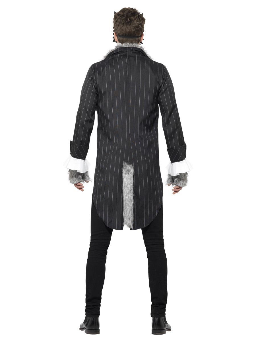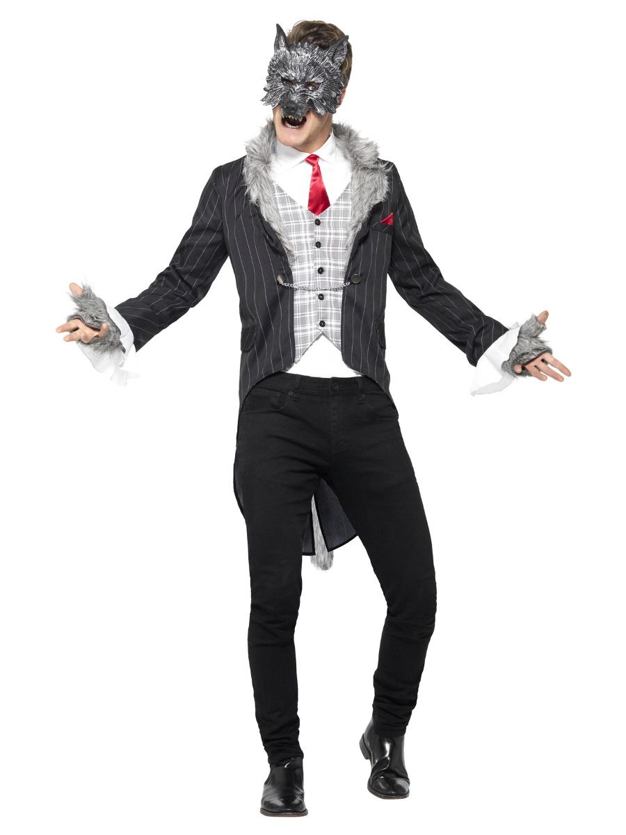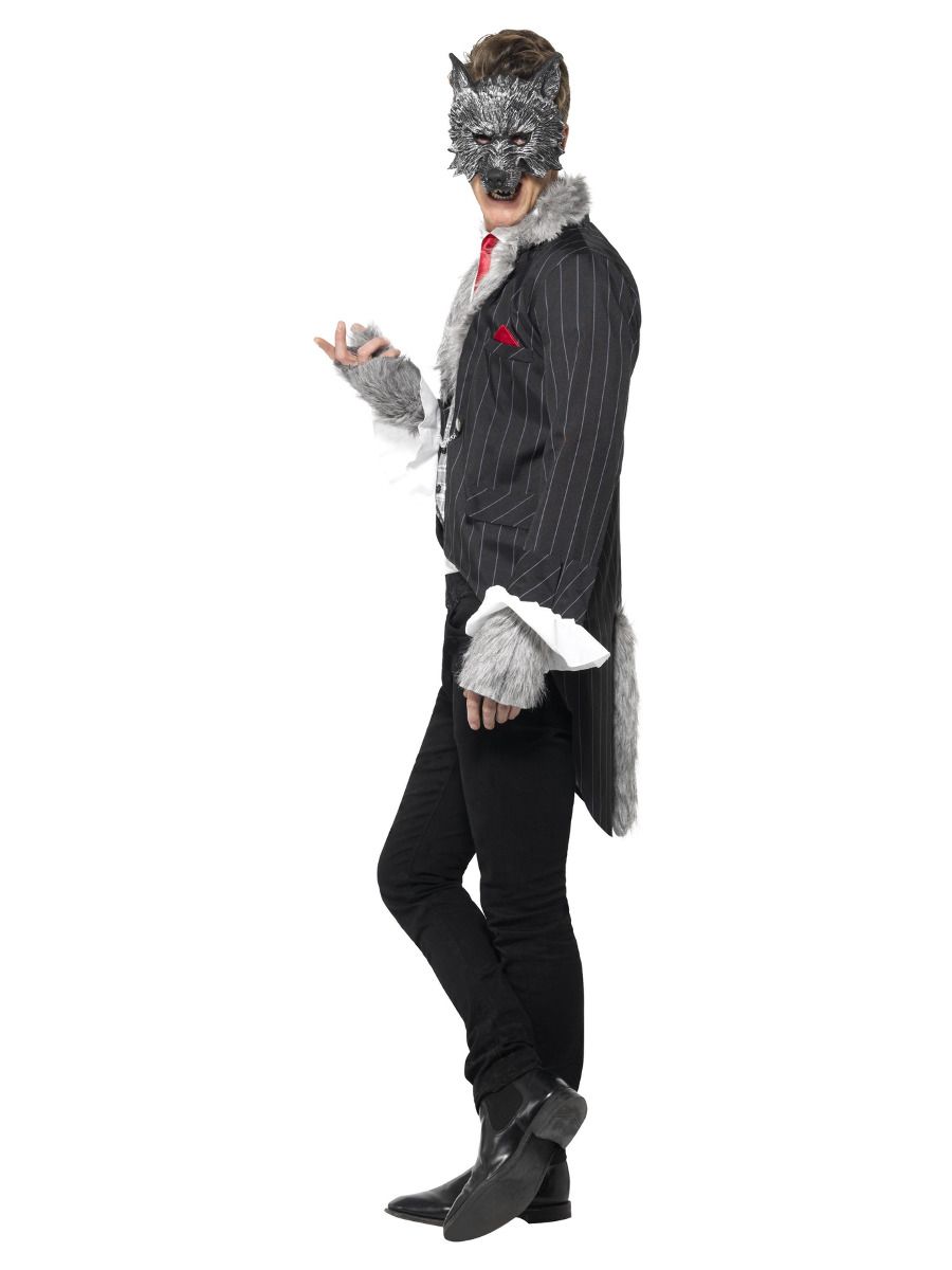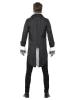 This costume includes a black jacket with grey pin stripes and a grey and white mock shirt.