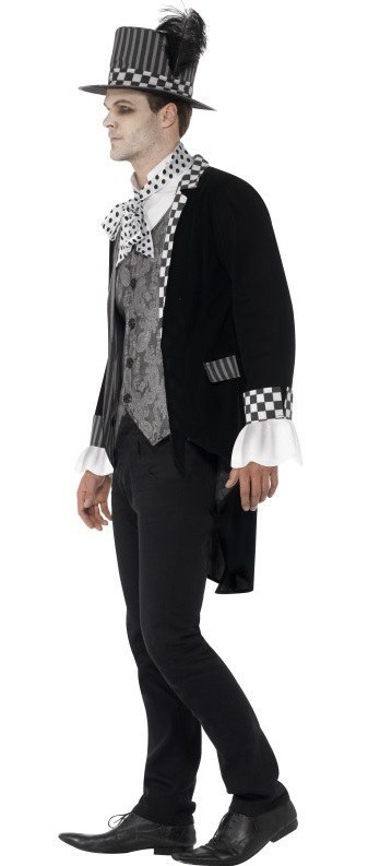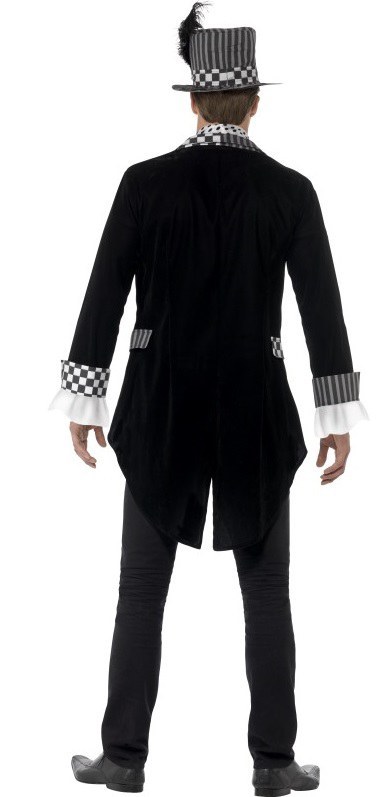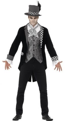 Deluxe Dark Hatter Costume includes a jacket with mock shirt and waistcoat and a neck tie. To complete the dark look a matching hat is also included.