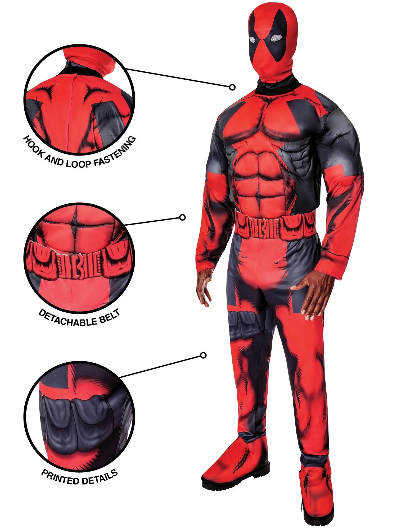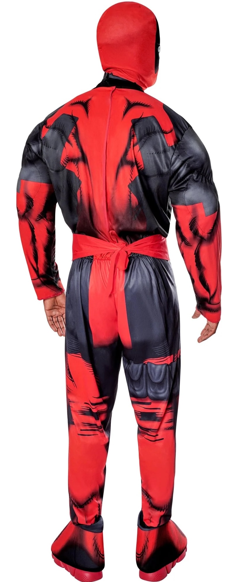 Deluxe Deadpool Costume includes a fibre-filled printed muscle chest jumpsuit. To complete the look an overhead fabric mask is also included.
