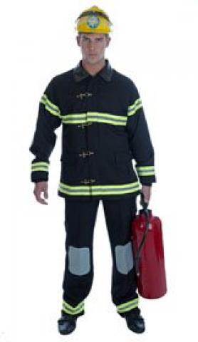 The Firefighter costume includes a black jacket with a green striped design and a pair of black trousers with a blue knee cap design.