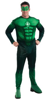 The costume includes a muscle chest printed green jumpsuit with attached boot covers and a green eye mask and ring.