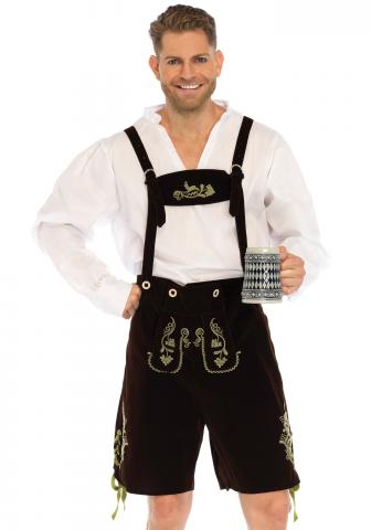 This high quality authentic Oktoberfest Lederhosen Costume for the true beer lover. Outfit includes velvet shorts with authentic embroidered German design and lace up detail, detachable bib suspenders, and peasant shirt.