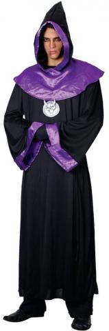 Devil Worshiper costume includes a long black hooded robe with purple trim along the sleeves and hood. The robe also features a purple collar and Satan medallion.