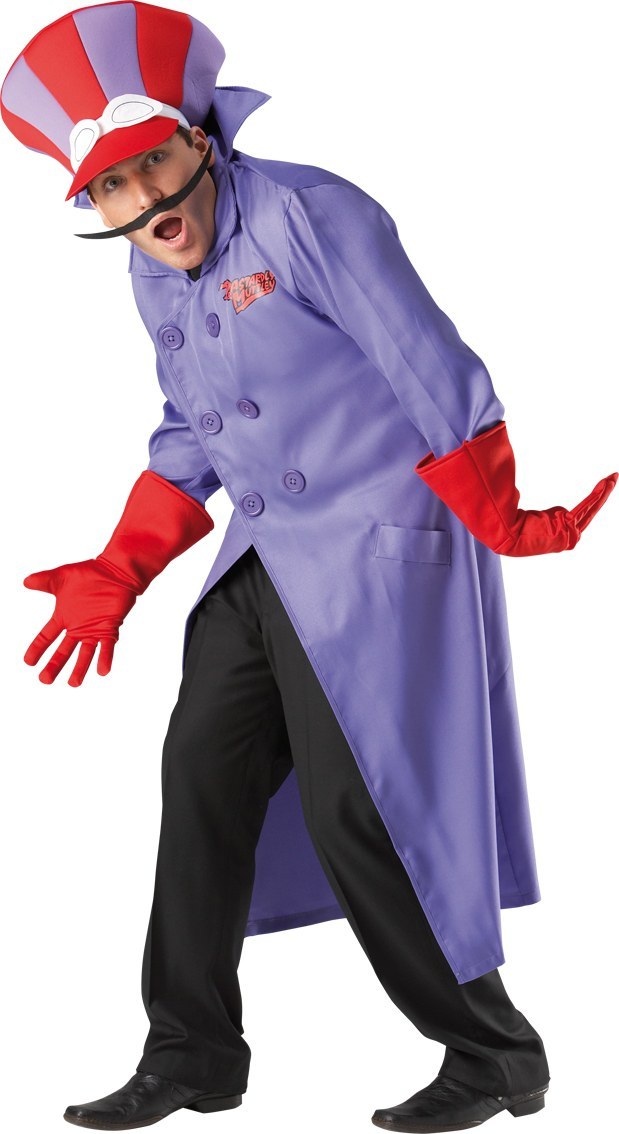 Our fun Wacky Races Dick Dastardly Costume includes a long purple coat with a double breasted front and a high upturned collar. Also included is an oversized red and purple hat with white glasses printed on and a pair of red gloves. To complete this wacky look a black character moustache is also included.