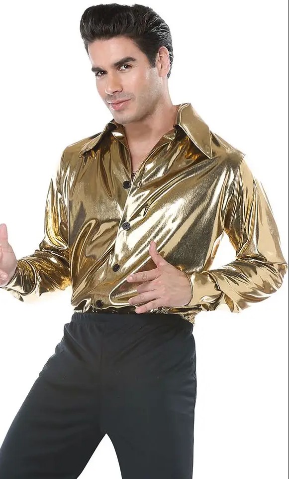 The Disco King costume comes with a flashy gold shirt and a pair of bellbottom pants.