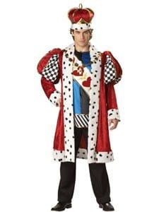 The Elite King of Hearts costume consists of a fur trimmed red velour coat, a sleeveless tunic and a shoulder sash. It also includes a deluxe crown and medallion necklace